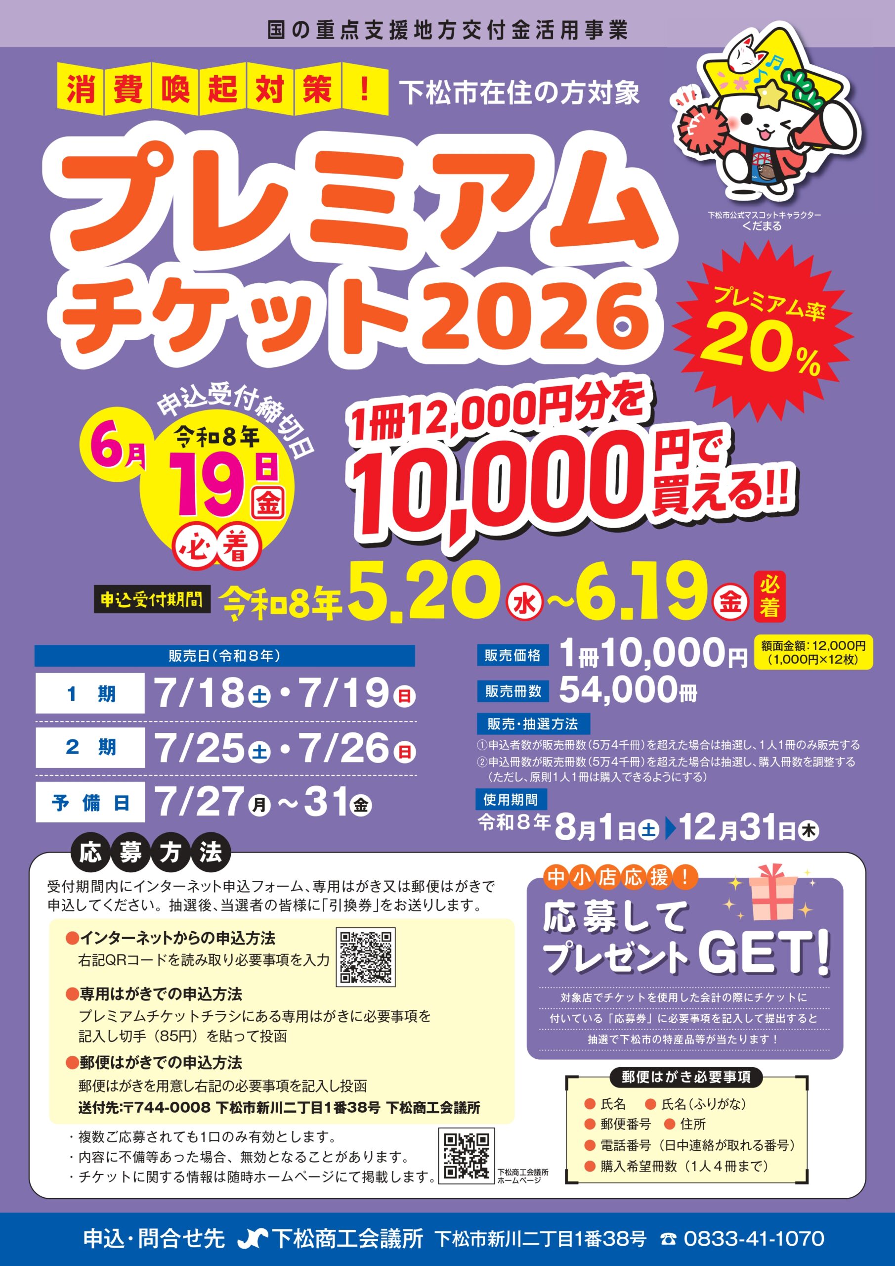 下松商工会議所では、物価高騰等により、大きな影響を受けている市内事業者、関連事業者及び市民生活を支援するとともに、地域経済を活性化させる消費喚起対策を実施するため、店舗等で幅広く使える『消費喚起対策!下松市プレミアムチケット2026』(国の重点支援地方交付金活用事業)を販売します。