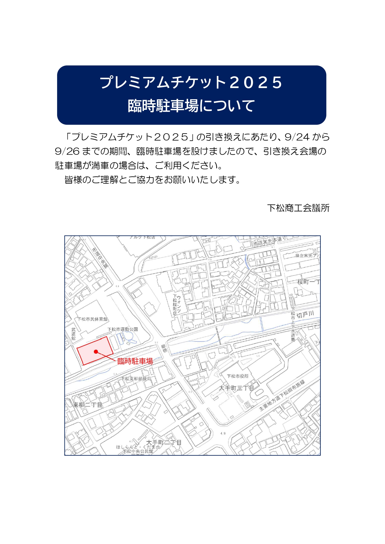 お知らせ プレミアムチケット2025 臨時駐車場のお知らせ 2025.09.22 《「プレミアムチケット2025」引換券をお持ちの皆様へ》 9月24日から9月26日までの期間、下松市民体育館駐車場を臨時駐車場としておりますので、ご利用ください。 皆様のご理解とご協力をお願い申し上げます。