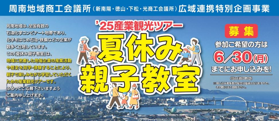 周南地域(下松・新南陽・徳山・光)商工会議所では、地域に密着した地場企業の産業活動や歴史を見学・体験することにより、親子で楽しみながら学習していただく『産業観光ツアー夏休み親子教室』を実施します。