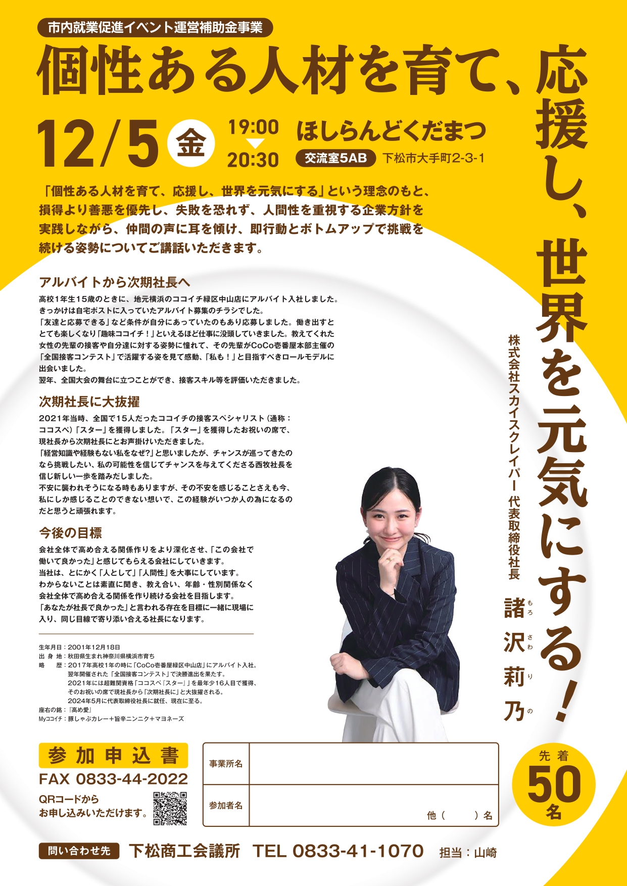 多くの転機を通して得た「人間性を大切にする組織づくり」「若い世代の可能性を伸ばす関わり方」など、これからの人材育成・人材確保に役立つ講演会となっています。